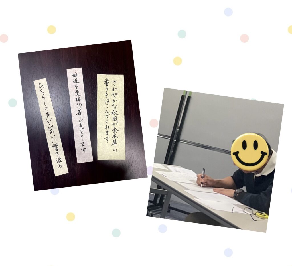今回はマンツーマンで、じっくりご対応しました。その方はすごくひらがなが上達されていて、びっくり。お話しを伺ったら、前回の基本のひらがな講座のときお渡しした教材で、お家でもコツコツ練習されていたみたいです。
