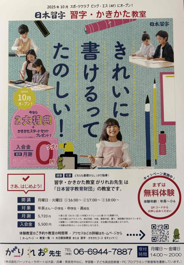 2025年10月より、大日駅前教室に 習字・かきかたコースが新規開講いたしました。